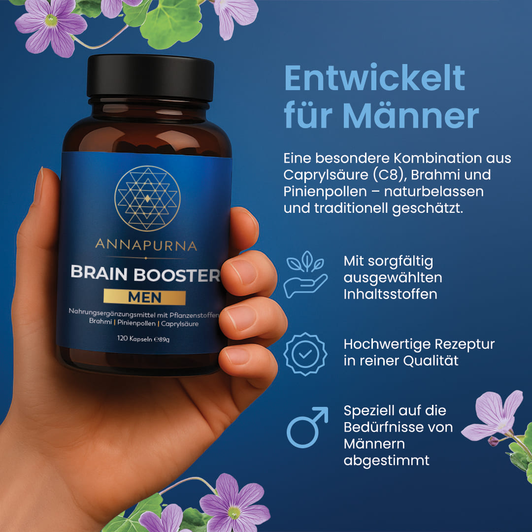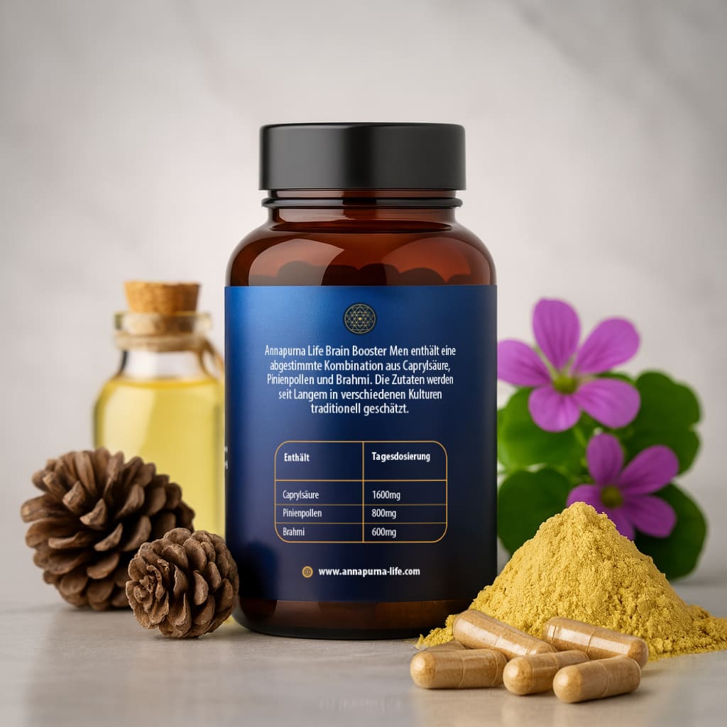 Ein klarer Kopf, stabile Energie und natürliche Unterstützung für den modernen Mann. Brain Booster Men kombiniert Caprylsäure (C8), Pinienpollen und Brahmi – sorgfältig ausgewählt, um Männer im Alltag zu begleiten.